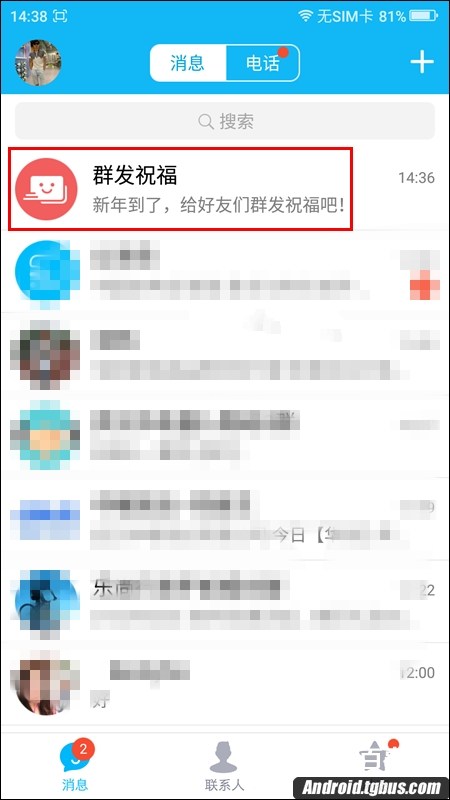 二、升級之後,我們便會聊天主界面看到【群發祝福】字樣,點擊進入,如下圖所示: