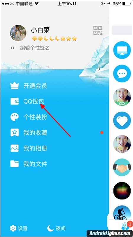 一、在手機中打開手機QQ,在其主界面的左上角點擊頭像,進入到個人中心界面,在其下方點擊進入【QQ錢包】,如下圖所示:
