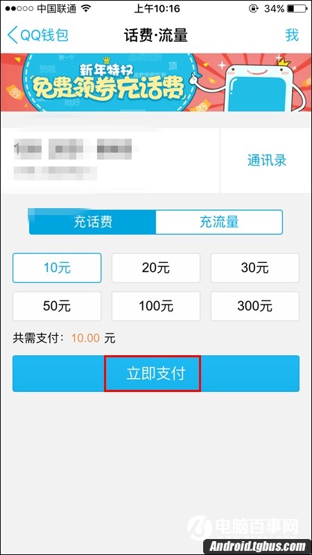 三、然後再輸入自己的手機號碼或其他人的手機號碼,選擇充值金額(10元、20元、30元、50元、100元、200元供選擇),然後點擊【立即支付】,如下圖所示: