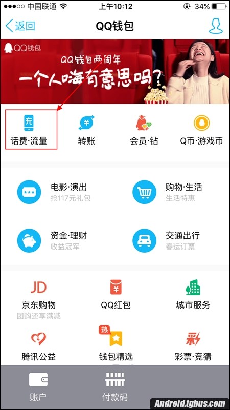 二、然後在QQ錢包頁面下方找到【話費-流量】選項,點擊進入,如下圖所示: