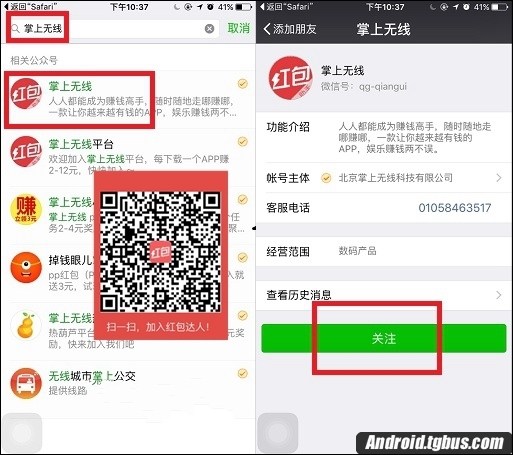 2.在微信中查找紅包達人的公眾號“掌上無線”並點擊“關注”,如圖: