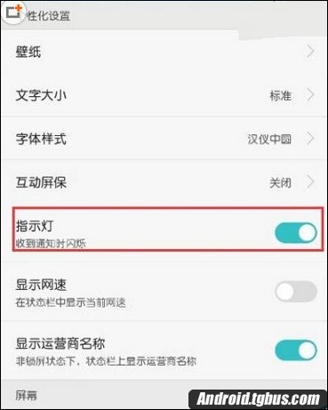 5、可以看到顯示的個性化設置中,指示燈選項中的圓點在右側,證明此時指示燈是開啟的;