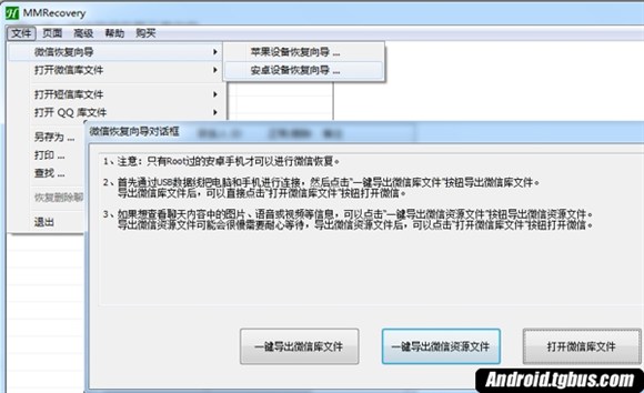 1、 首先通過USB數據線把電腦和手機進行連接,然後運行恢復工具MMRecovery,接下來如下圖點擊 “文件”菜單,然後再點擊“微信恢復向導” 子菜單,繼續再點擊“安卓設備恢復向導”,將會彈出“微信恢復向導”對話框。