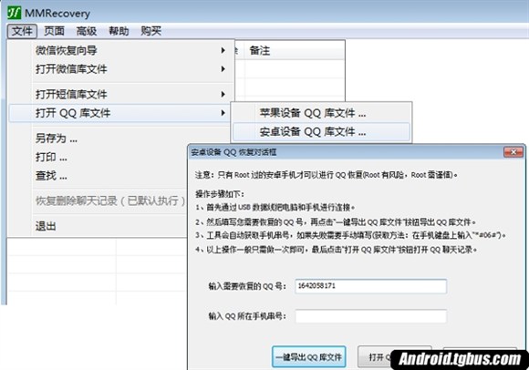 2、 在“安卓設備QQ恢復”對話框中,如下圖輸入您需要恢復的QQ號,然後再點擊“一鍵導出QQ庫文件”按鈕導出QQ庫文件。