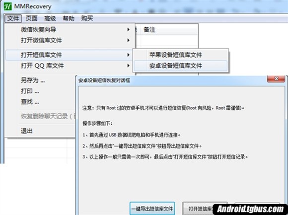 1、 首先通過USB數據線把電腦和手機進行連接,然後運行恢復工具MMRecovery,接下來如下圖點擊菜單“文件”,再點擊“打開短信庫文件”子菜單,再點擊“安卓設備短信庫文件”,將會彈出“安卓設備短信恢復”對話框。
