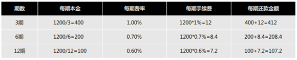 招商銀行向您提供的分期付款服務含有資金成本、運作成本和風險成本,因此會向您收取一部分手續費。為了最大化降低您的還款壓力,您的分期手續費是按月收取的,具體比例如下: (以訂單金額1200元為例)