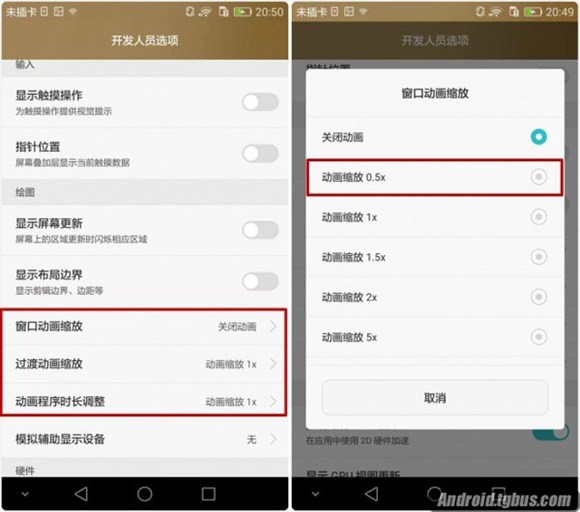 和上面一樣,先打開開發人員選項,往下拉找到窗口動畫縮放等三項,將這三項動畫時常都設置為0.5x。