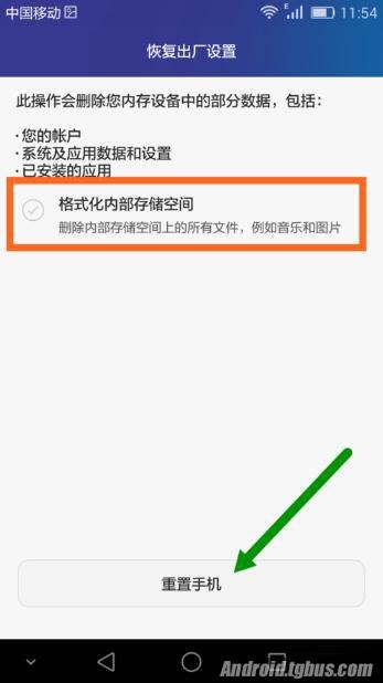 3、【格式化內部存儲空間】(刪除內部存儲空間上的所有文件例如音樂和圖片),內部存儲空間指的就是手機16G自帶空間不是SD存儲卡,這是一個可選項,你根據自己情況進行勾選。如果打鉤了才會徹底和新機完全一樣沒有什麼使用痕跡,但是如果你占用手機空間存儲了照片視頻或重要文件的又不想復制備份轉移到SD卡,那就別打鉤。