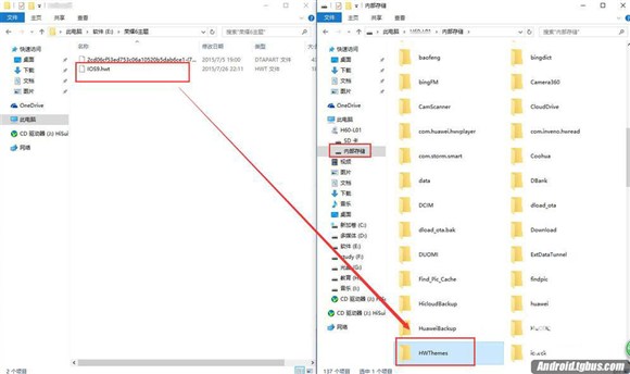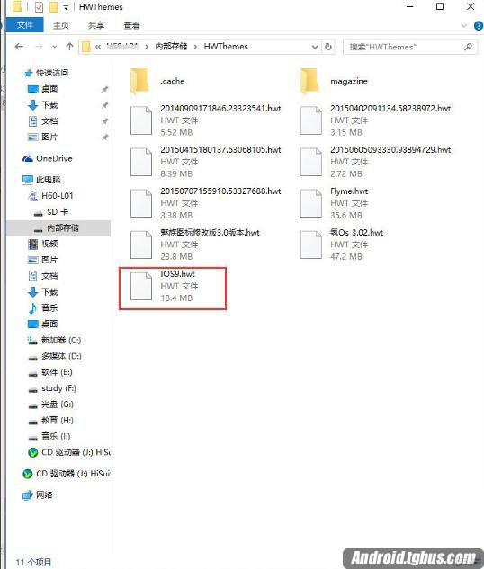 2、在打開的窗口中找到“HWThemes”文件夾,並將已下載好的第三方主題文件復制到該文件夾中,第三方主題文件一般以hwt為後綴。