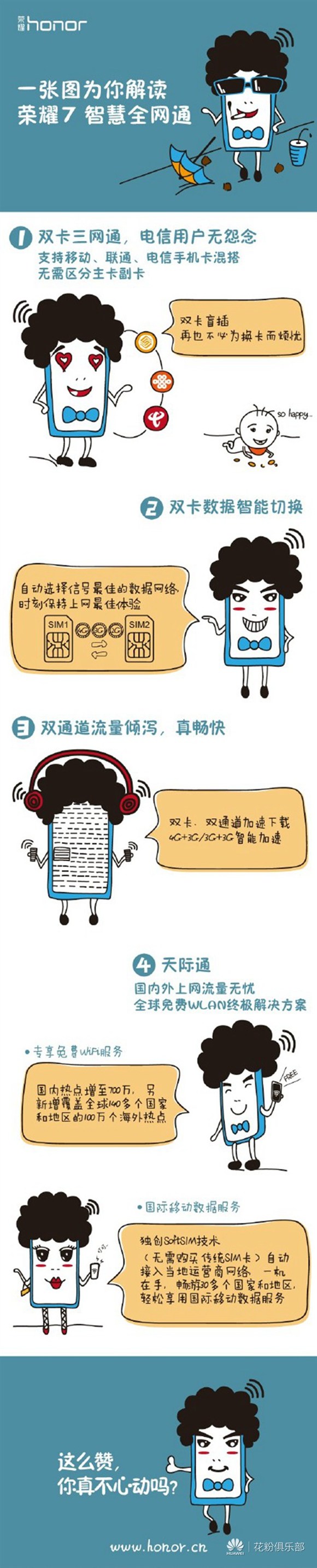榮耀7在網絡方面非常的強大,全網通版本支持智慧全網通功能,支持雙卡盲插,系統自動識別,再也不用區分主卡和副卡了。而且手機會根據你所處於的地理位置,可以智能選擇數據網絡環境較好的卡,讓你暢享順暢網絡。並且可以享受雙通道流量使用移動數據,再也不用為沒有網絡而擔心了,可以隨時隨地暢玩手機。