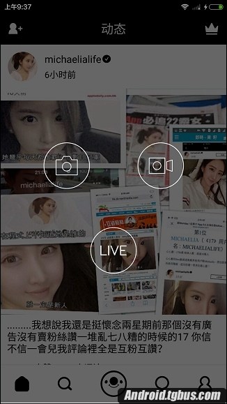 1、首先點擊首頁下方中間的按鈕。在這裡,你可以選擇發布照片、視頻、直播動態,小編為大家演示第一種,即照片動態。點擊第一個按鈕。