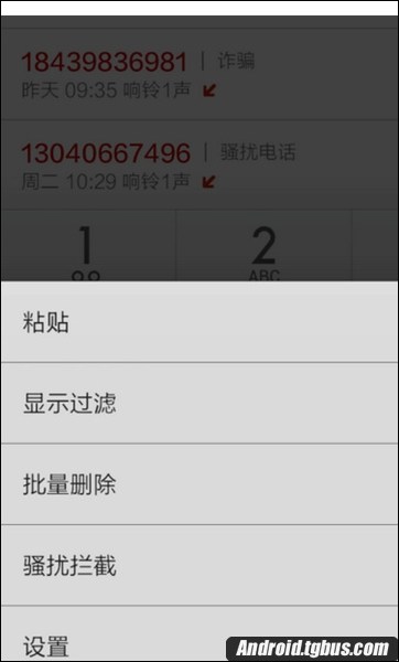 2、此時,按手機左下方的圖標為三橫的功能鍵(在屏幕顯示區域下方最左邊),則彈出下圖界面,再點擊最下邊的“設置”,進入下圖界面,點擊下方的“通話錄音設置”;