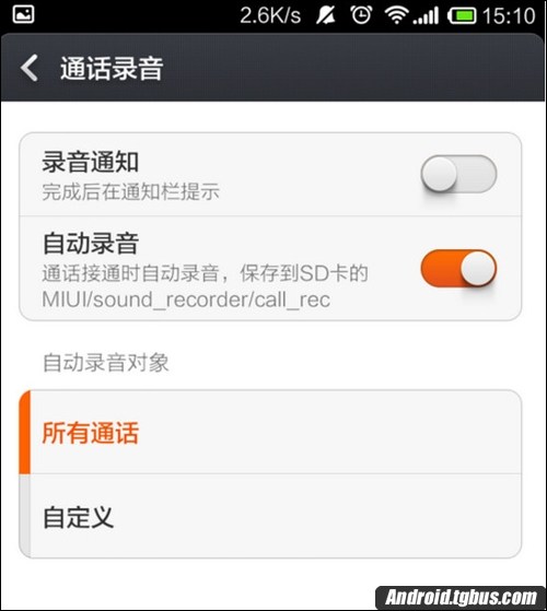 3、進入到如下圖的 “通話錄音”設置界面,選擇如下圖的設置,則可以對所有通話錄音;