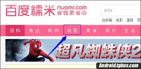 1、打開百度糯米網,在主頁上選擇“電影”類別。