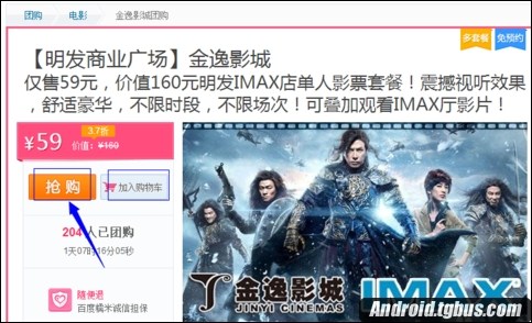 3、進入詳細地介紹頁面後,可以點擊“搶購”或者“加入購物車”,我這裡點擊“搶購”直接購買電影票。