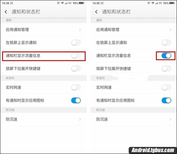 2、然後在【通知和狀態欄設置】界面,在下方找到並開啟【通知欄顯示流量信息】開關即可,如圖所示:
