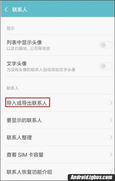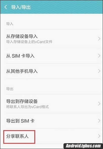 3、在選擇界面下,讀者可以選擇導入導出聯系人選項,點擊進入下一級界面;