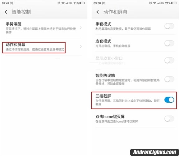 我們將屏幕下拉菜單即可看到內置了截屏開關,只需點擊一下即可快速截屏。開啟三指截屏後,在任意界面三指向上或向下快速滑動即可快速截屏。