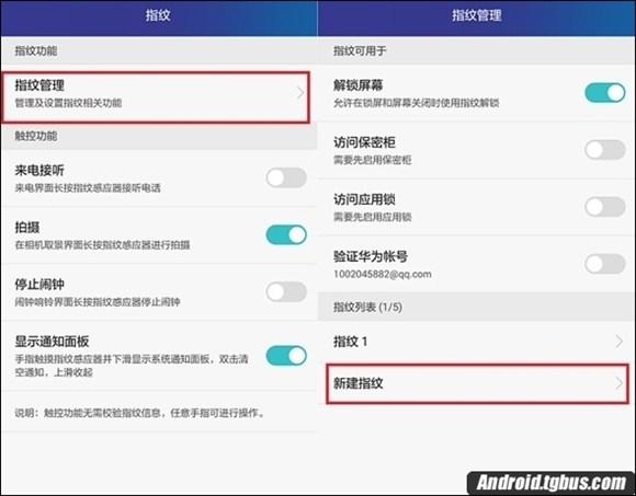 二、然後在華為Mate S設置中,再找到並點擊進入【指紋】設置,隨後再進入【指紋管理】設置界面,接下來點擊底部的【新建指紋】,然後按照提示將手指放在在手機背面攝像頭下方的傳感器中,錄入自己的手指指紋即可,如下圖所示: