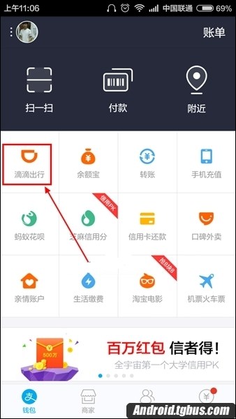 1、首先,打開支付寶首頁,首頁第一位你就能夠看到“滴滴出行”,點擊進入,如下圖所示: