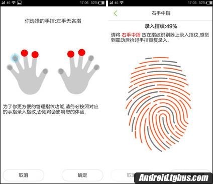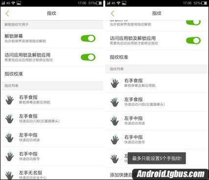 從紅辣椒X1的指紋設置界面來看,其支持指紋解鎖、應用鎖等功能,最多可錄入5組指紋,並且在錄入過程中,需點選相對應的手指。其實,對大多數人來講,也就左/右手的食指方便在背面使用。