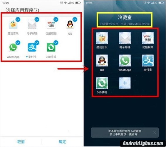 2、點擊加號之後我們就發現有很多可以加入冷藏室的應用,這時候我們發現可以多選,然後批量加入,這就是在桌面不能實現的了,加入後我們發現有一個提示“已冷藏7個應用,節省了815MB內存空間”,一目了然,很清晰。