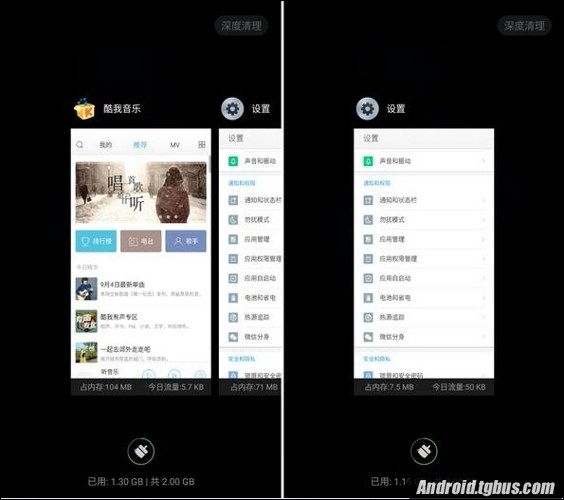 4、然後我們來看下加入冷藏室前後的對比,左邊是加入前,右邊是加入後,這了後台我沒有進行過任何清理,我們發現加入冷藏室後後台運行不見了,並且清除了內存,說明加入冷藏室的應用被凍結了。