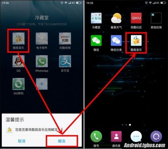 3、想要解除冷藏是我們只需要單擊應用選擇解凍即可,期間有個動畫效果,挺有意思,我們發現應用又回到桌面了。