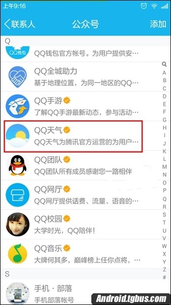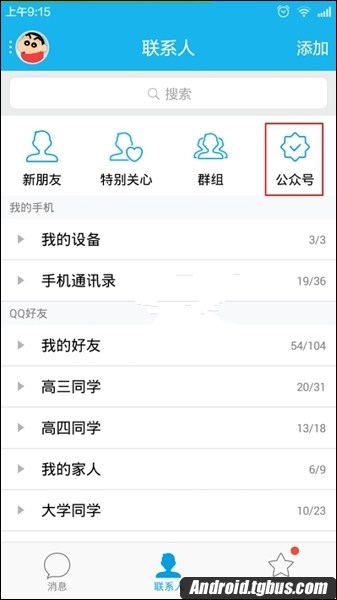 1、首先進入到QQ,進入到聯系人界面,在其頁面找到【公眾號】如下圖所示。