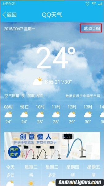 4、如果發現不是不是你所在城市的天氣,我們還可以在其頁面的右上方進入到QQ天氣詳細頁面進行城市切換,如下圖所示。
