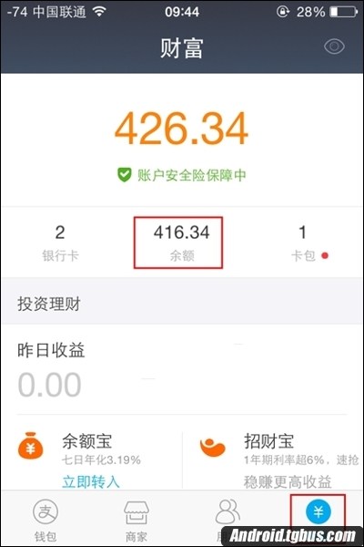 1、在手機上打開支付寶9.0並登陸,然後點擊底部的“財富”,然後再點擊篇中間位置的“余額”字樣圖標,如下圖所示。