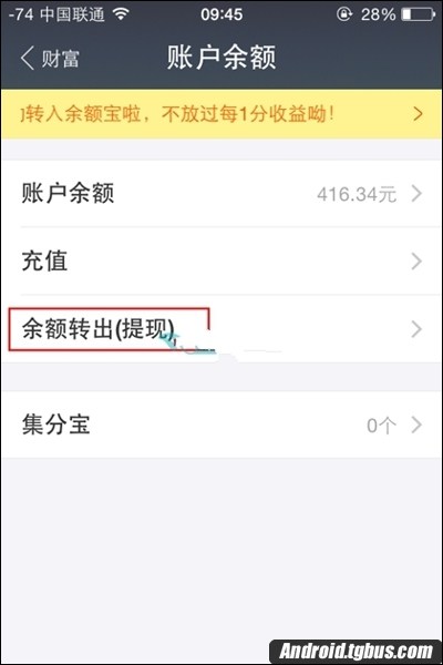 2、隨後進入到賬戶余額界面,在其下方點擊“余額轉出(提現)”字樣,如下圖所示。