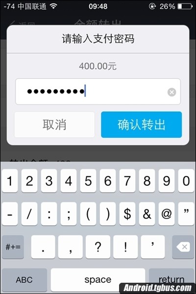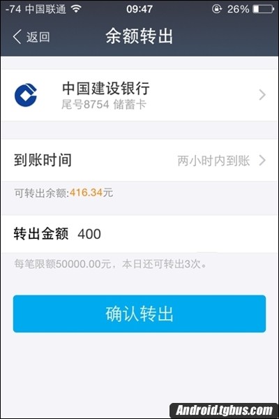 3、接下來輸入轉出金額,也就是提現金額,比如百事網小編輸入400元,然後點擊確認轉出,如下圖所示。