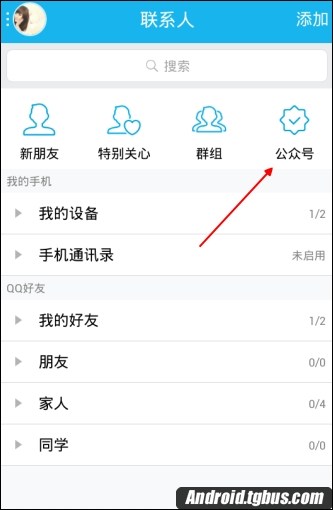 1、首先第一步打開最新版的手機QQ,在聯系人列表點擊進入【公眾號】。