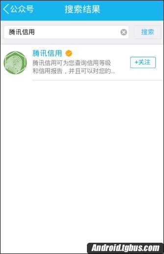 2、接下來可以在搜索框輸入【騰訊信用】這樣查找起來就比較快,找到之後先點擊【關注】。