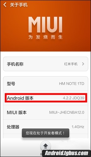 1、紅米Note2連接電腦前,我們先到紅米Note2的設置中找到關於手機,可以看到一項Android版本,連續按4次,其實也不用管幾次,你就不停的按,就會出現您現在處於開發者模式。