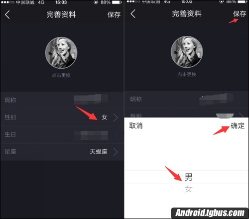 2、在編輯中,我們可以看到昵稱、性別、生日等資料,在性別中更換確定保存即可。