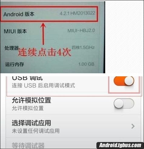 2、在“關於手機”下可以看到安卓版本,連續點擊此處大概4次即可打開開發人員選項,在開發人員選項界面打開紅米USB調試模式。