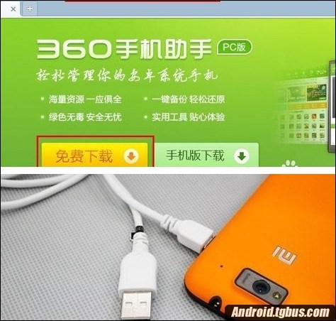 3、下載360手機助手PC版,然後在手機中安裝,安裝完成後將360手機助手打開。將紅米手機用數據線與電腦USB接口相連,如圖所示。