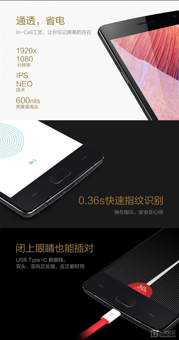 除此之外,一加手機2還集成了正面指紋識別,支持支付寶移動支付,支持雙卡雙待,USB Type-C數據線,3300mAh容量電池等。