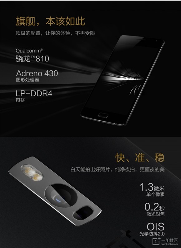 核心硬件方面,一加手機2搭載了高通骁龍810處理器,並采用了軟硬件相結合的散熱技術,官方稱該散熱方案能有效控制其發熱,另外輔以3GB/4GB LPDDR4內存以及16GB/64GB機身存儲空間。
