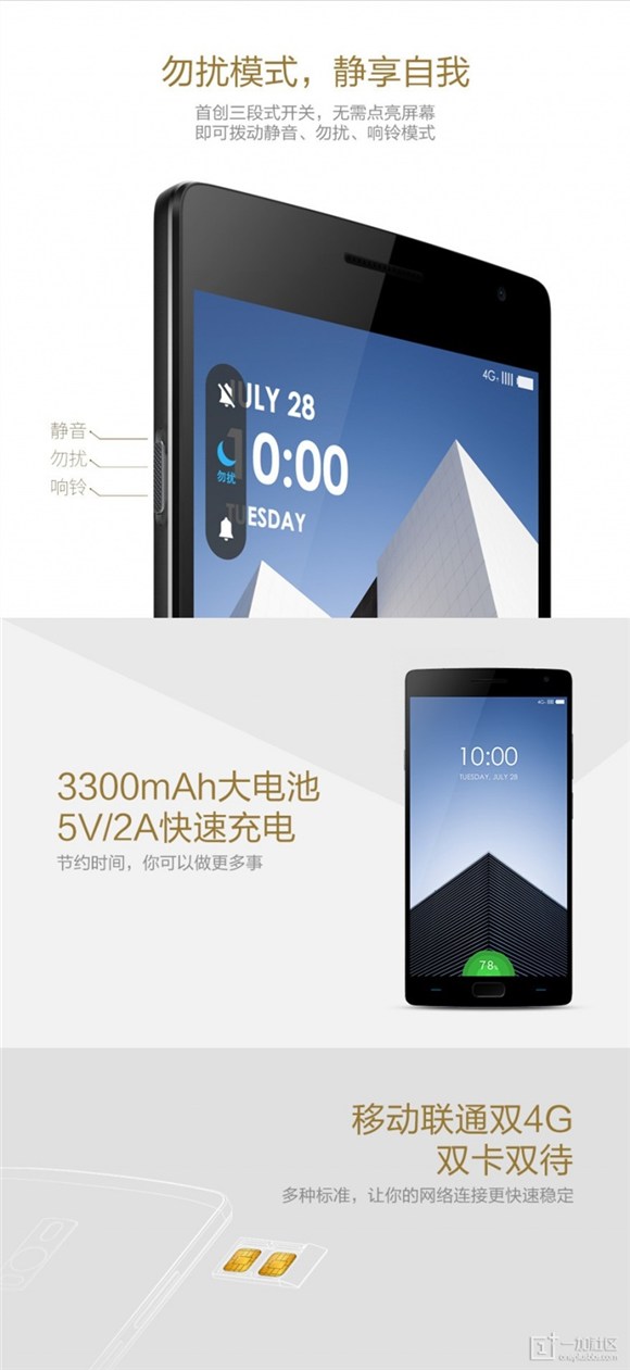 在機身側面,一加手機2還提供了一枚三段式情景控制開關,可以在靜音、勿擾等模式間快捷切換。