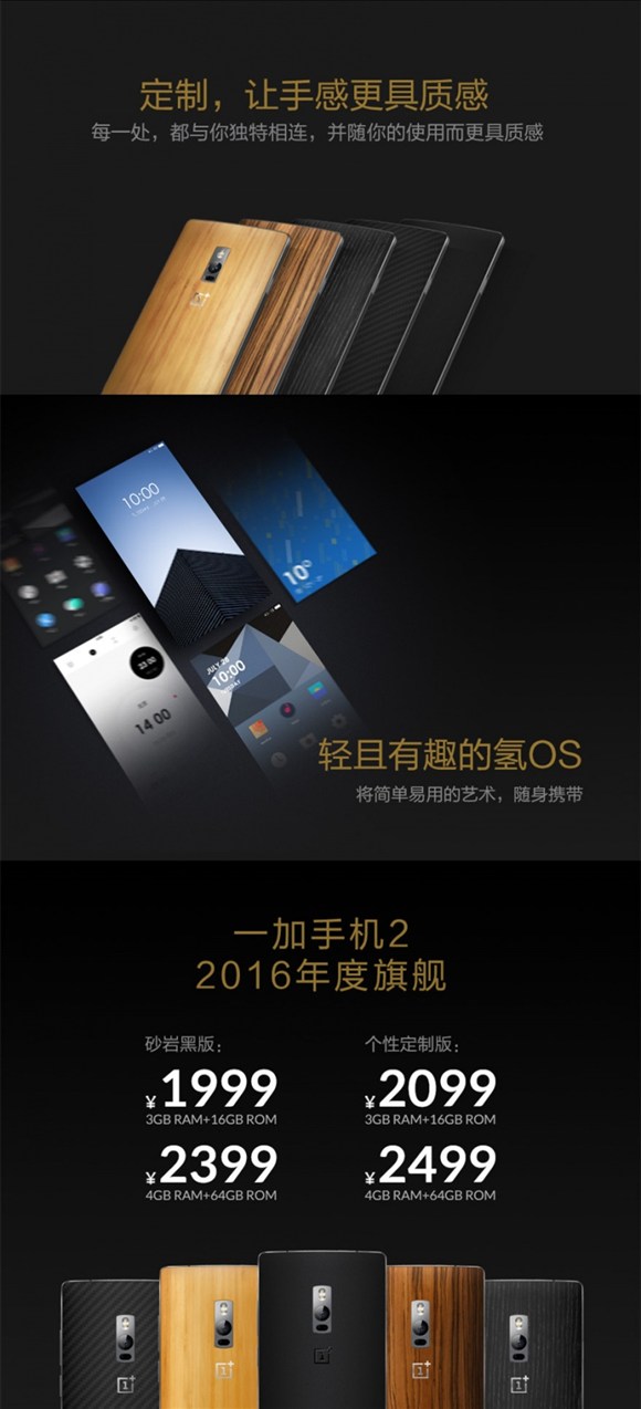 價格以及上市時間方面,一加手機2標准版(3GB內存+16GB機身存儲)/高配版(4GB內存+64GB機身存儲)售價分別為1999和2399元,選擇竹質、黑杏、酸枝、凱夫拉後蓋定制版機型需要加價100元,也就是2099元和2499元。線上渠道8月4日正式現貨開售,線下渠道將於8月4日在北京、上海零售店發售,8月15日起在全國20多家授權店開啟線下銷售。
