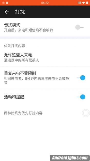 3、“重復來電不受限制”,開啟之後,相同來電者,5分鐘內第三次來電不會被靜音。