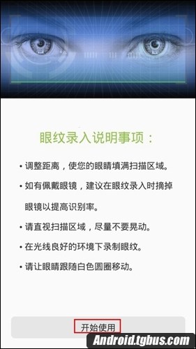 2、進入到眼紋錄入說明事項,點擊“開始使用”,如下圖所示。錄入眼紋時,界面之所以為“白色”,是為了起到補光的效果,讓眼部更加清晰。