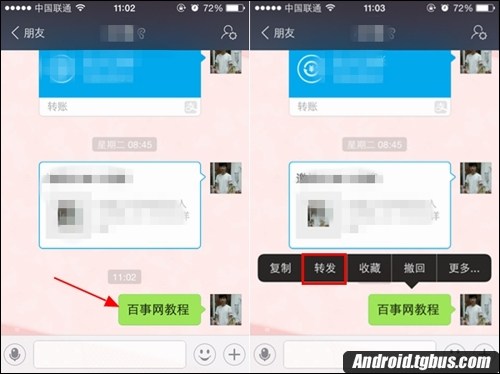 1、首先找到一個朋友進入不到聊天界面,然後找到一條自己想轉發的信息,然後長按系統就會彈出對話框,這個時候選擇【轉發】按鈕,如下圖所示: