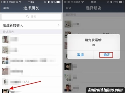 2,然後返回到朋友界面,選擇一位想要轉發的朋友,最後點擊一下【確定】即可發送成功,如下圖所示:
