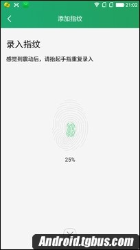 二、大神Note3設置指紋操作過程是比較簡單的,要在添加指紋界面,將手指重復放入在指紋識別器,感覺到震動之後,抬起手指重復錄入,如下圖所示: