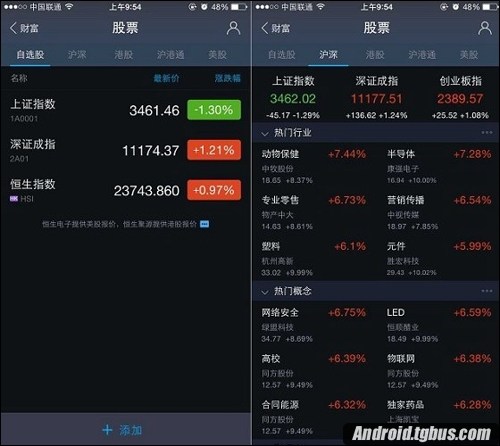 1、在財富界面,點擊進入“股票”就可以看到一些熱門股市信息了,包括自選股、滬深、港股、每股等等,用戶還可以點擊底部的“添加”自行添加所關注的股票,如下圖所示。