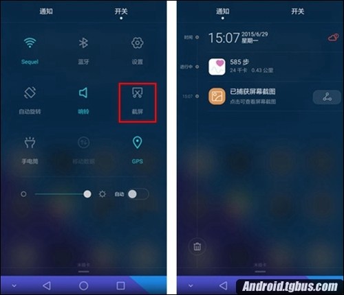 由於榮耀7運行的是EMUI 3.1系統,所以還有一種截屏方法就是下拉菜單進行截圖,這和榮耀6以及榮耀6 Plus的截圖方法是一樣的,用手指將屏幕向下滑動一下看到【截屏】字樣點擊一下便可截圖,如下圖所示。